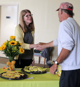Kim Flowers greets an attendee at a dedication for Co-op Solar, the community solar program created by Wabash Valley Power Alliance and its member co-ops.