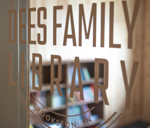 A close-up of the Dees Family Library located in the new Kampen Dining Hall at Camp Tecumseh. The library features books donated by previous camp attendees.