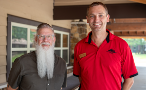 Joe Spear, energy advisor at Carroll White REMC, with Camp Tecumseh CEO Joel Sieplinga on the porch of the new dining hall. The new building includes a 7,000-square-foot patio with chairs and areas for classes for summer camp attendees and visitors to enjoy.