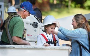 Parke County REMC employee Madison Cooper, right, helps a Camp Kilowatt attendee with a hard hat while on a bucket truck. Camp Tecumseh hosts the annual camp sponsored by electric cooperatives throughout Indiana.