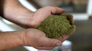 Noble Organic Grains owner Joel Mecklenburg’s ground alfalfa. Noble Organic Grains received Power Moves® rebates from Noble REMC, its electric cooperative, for energy efficiency upgrades to motors installed as part of an expansion to create organic animal feed pellets.